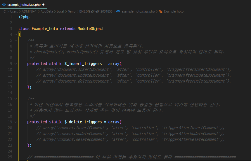 Example_hoto 클래스를 생성하며, ModuleObject 클래스를 상속받았기에, XE Module에서 제공하는 기본적인 함수를 사용할 수 있다.